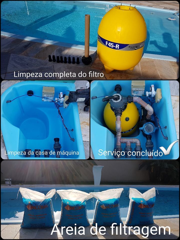 Um item importantíssimo de sua piscina é o filtro, ou seja a areia, ela é responsável por quase a totalidade da limpeza da mesma. E ela deve ser trocada cerca de 5 em 5 anos, ou quando houver o nível abaixo do ideal.